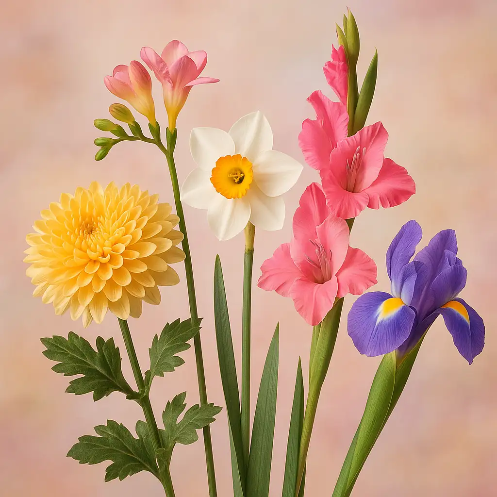 Meaning of flowers — chrysanthemum, freesia, narcissus, gladiolus, iris | Lotus724 (no text on image)